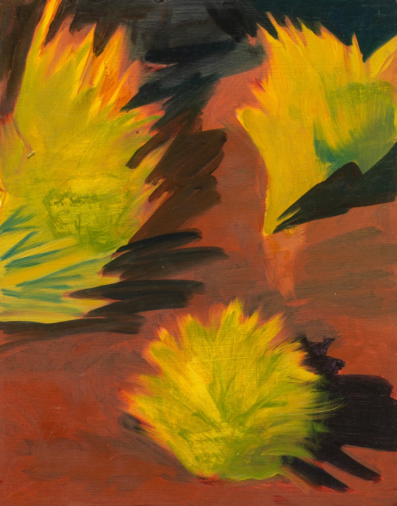 While subtly secreting his own modes of capture Francesco shares with us the precious products of his perception, but makes no greater claim to the land. No land is truly ours, and no painter today, working in, with and from the land can avoid consideration of a wider ecology. Climatological forces show disdain for human bounds and borders; hurricanes and wildfires rip regardless through all-too-human structures, and yet this foreboding ‘scape’ can still be inflected by those who encounter and record it. So, while the climate is dramatically changing, we acknowledge that both the land and our self are also and always in flux, glacially progressing, ever in in process, elemental and eruptive, ancient and renewed, splitting and spilling only to reform.