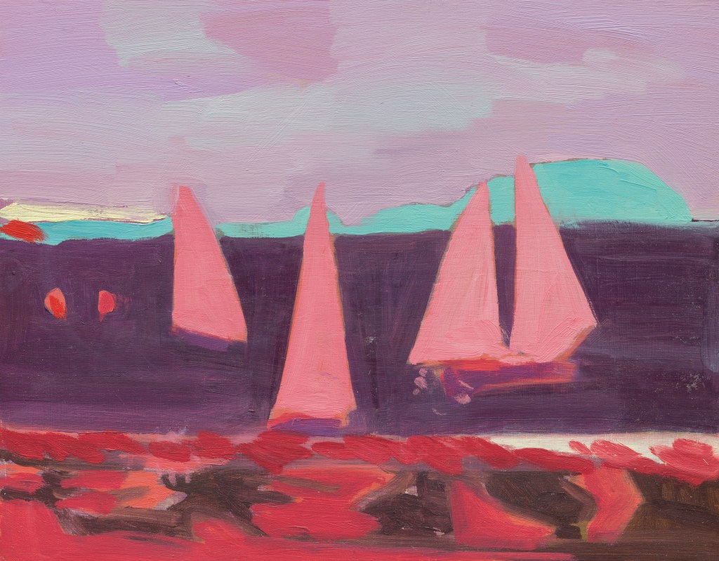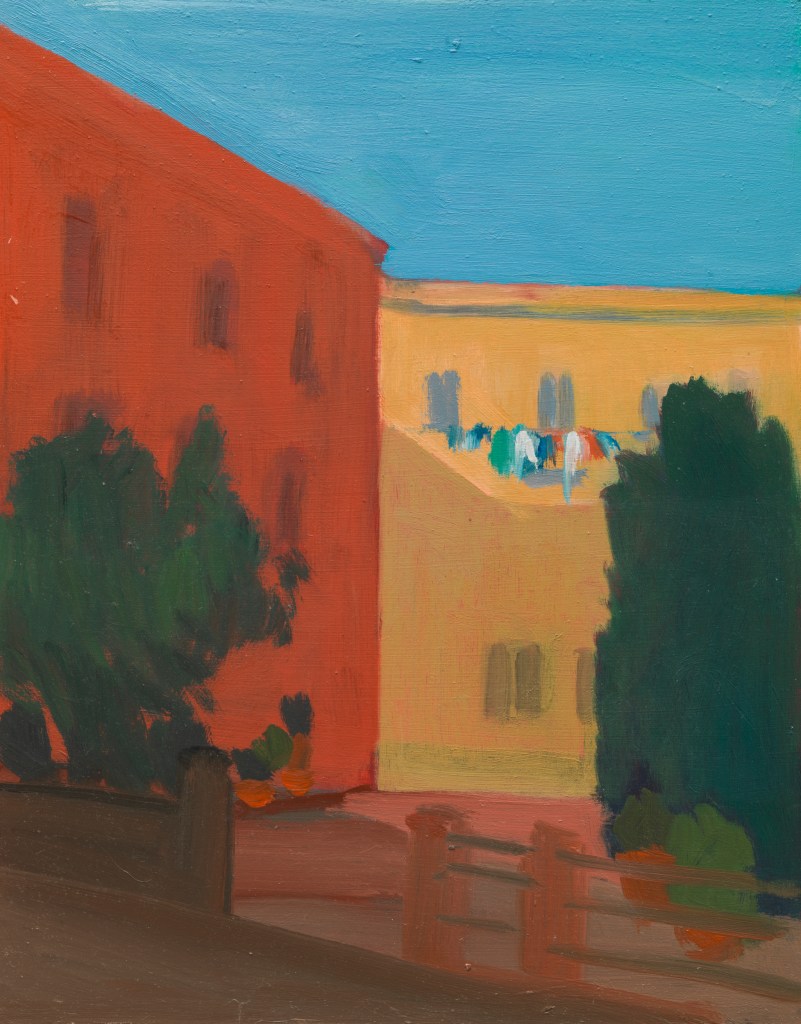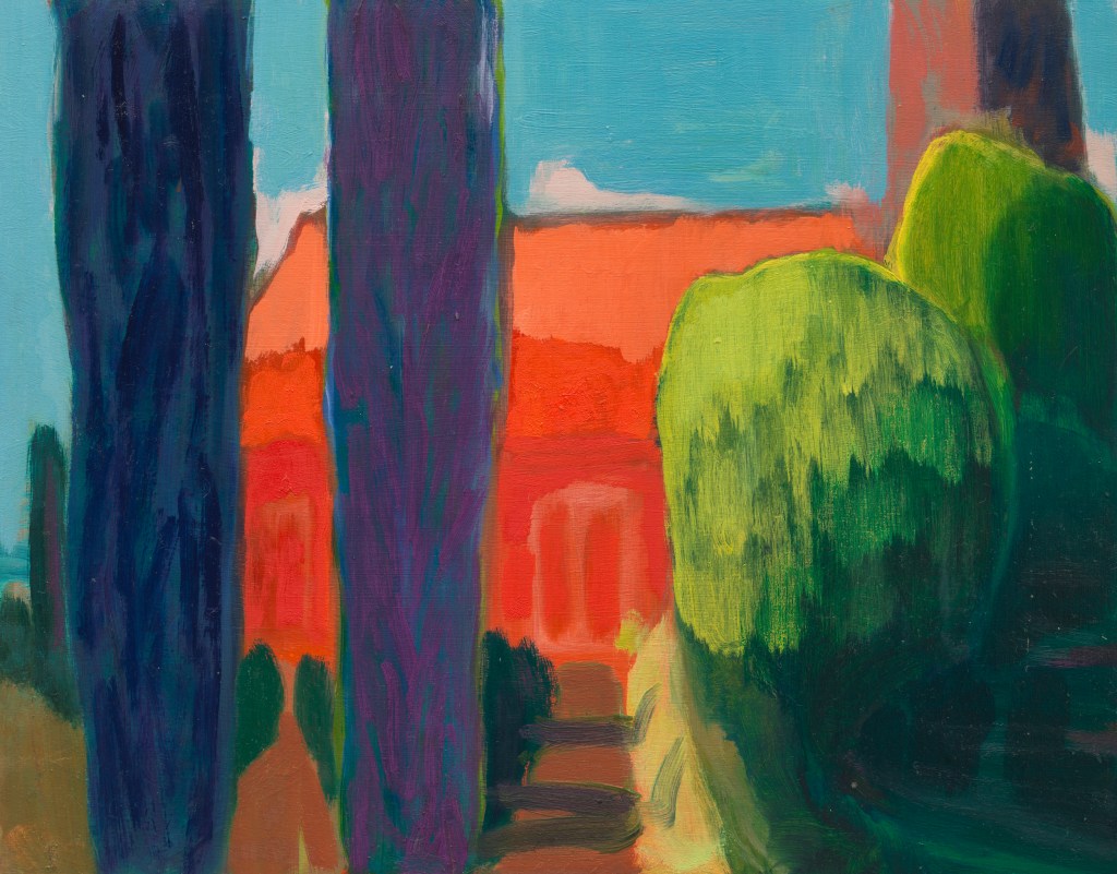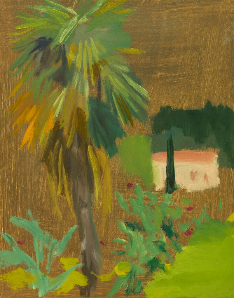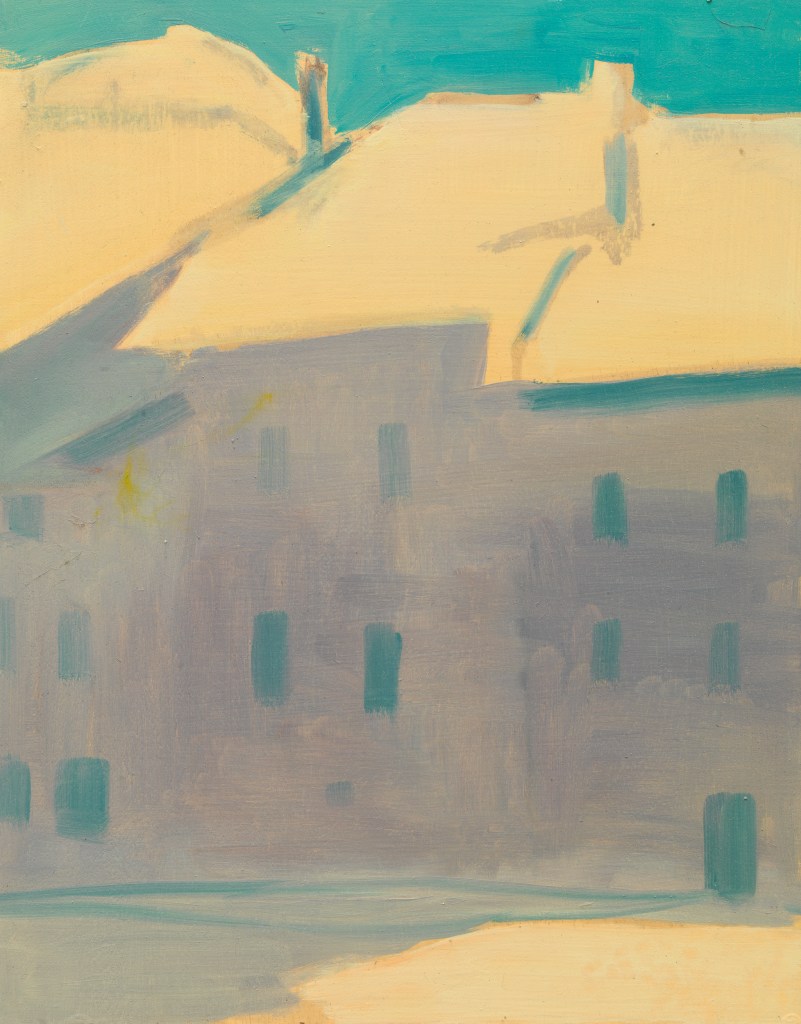 In one painting we see pale rose slices, split like slate, suggesting a scene of pleasure boats with sullen sails stilled on a breathless afternoon. Elsewhere a deep majestic blue is chased by the artist’s scumbling brush into a thorny hedgerow or impenetrable rockface. A villa’s cream wall is gently baked by afternoon sun, and with the coming of night car headlamps slink along purple mountain roads to roll across a shallow valley floor. Into these scenes the painter peers, conducting a celebration of the senses.